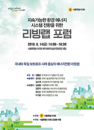 서울시의회 김정환 시의원(환경수자원위원회)의 주관으로 지속가능한 환경 에너지 시스템 전환을 위한 리빙랩 포럼이 열린다. 14일 오후 2시~4시30분 중구 서울시의회 제1대회의실에서 한다. 이번 포럼의 주제는 ‘국내와 독일 보트로프 사례 중심의 에너지 전환 리빙랩’이다.