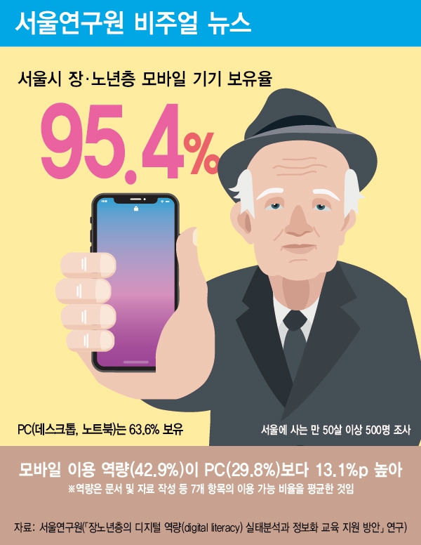 두 기관이 공동으로 진행한 「장노년층의 디지털 역량(digital literacy) 실태분석과 정보화 교육 지원 방안」 연구를 살펴보면 서울시 장노년층 중 95.4%는 모바일 스마트기기를 보유하고 있고, 63.6%는 데스크탑이나 노트북을 보유하고 있는 것으로 나타났습니다. 이용 역량도 모바일이 13.1% 높습니다.