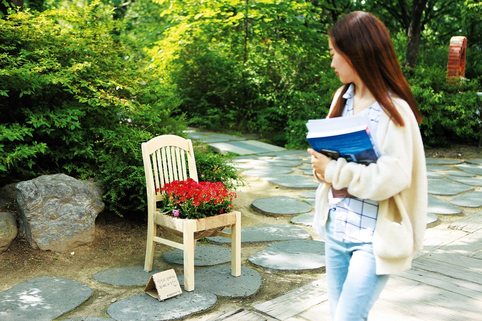 지난달 30일 기말고사를 앞둔 홍익대학교의 한 학생이 학생회관 앞에서 서울시 일자리 대장정 사업에 참여한 설치미술가 이효열씨의 꽃의자 작품을 보며 강의실로 가고 있다. 장수선 인턴기자 grimlike@hani.co.kr