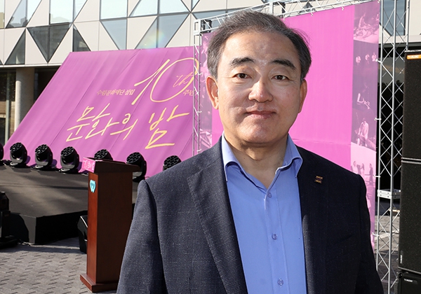 지난 11일 오후 수림문화재단 10주년 기념식을 앞두고 수림아트센터 2층 재단 사무국에서 만난 유진룡(63) 이사장의 말이다. 동대문구 홍릉에 있는 수림문화재단은 재일동포 사업가이자 중앙대 이사장이었던 고 김희수 선생이 2009년 전 재산 1천억원을 내 만들었다. 민간 문화재단 출연금으로는 가장 큰 규모다.