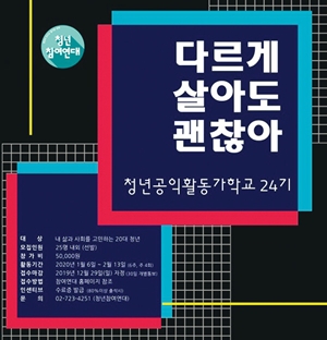 참여연대가 29일까지 청년공익활동가학교 24기 ‘좀 다르게 살아도 괜찮아!’ 참여자를 모집한다. 청년공익활동가학교는 삶과 사회를 함께 고민하는 청년들의 학교이자 놀이터를 지향한다. 6주 동안 진행되는 과정에서 인권·평화·성평등 등을 주제로 한 시민교육과 스스로 주제를 정해 기획·실행하는 ‘직접행동 캠페인’에 참여할 수 있다. 참가비는 5만원이며, 참여연대 누리집(peoplepower21.org)에서 신청하면 된다.