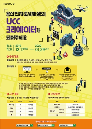용산전자 UCC공모전 사무국이 29일까지 UCC 크리에이터를 공모한다. 이번 공모는 용산전자상가의 공간특성과 도시재생비전, 도시재생 현황과 긍정적 변화 등을 홍보하기 위해 마련되었다. 누구나 참가 가능하며, MP4(유튜브 업로드 가능 파일 형식) 포맷으로 FHD(1920×1080) 해상도의 3분 이내 작품을 올리면 된다. 총 5팀에 400만원의 상금을 준다.