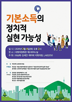 다음세대정책실험실(LAB2050)이 ‘기본소득의 정치적 실현 가능성’ 토론회를 여야 3개 정당(더불어민주당, 자유한국당, 바른미래당) 국회의원들과 함께 연다. 행사는 2월4일 오후 2시 여의도 국회의원회관 제2세미나실에서 열린다. 안효상 기본소득한국네트워크 상임이사가 ‘기본소득의 정치적 실현 가능성’을 발표한다. 윤형중 LAB2050 정책팀장이 ‘기본소득의 재정적 실현 가능성을 높이는 방안’에 대해 발제한다.
