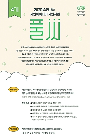 (재)숲과나눔이 시민 아이디어 지원사업 ‘풀씨’를 2월2일까지 공모한다. 환경·안전·보건 분야의 난제를 풀어나갈 아이디어가 주제다. 개인·단체 누구나 지원할 수 있다. 최대 50개 팀에 최대 300만원의 지원금을 준다. 우수 활동팀에는 스타트업 단계 최대 2천만원, 전국 확장 단계 최대 2억원의 추가지원도 한다. 숲과나눔 누리집(koreashe.org)에서 신청하면 된다.