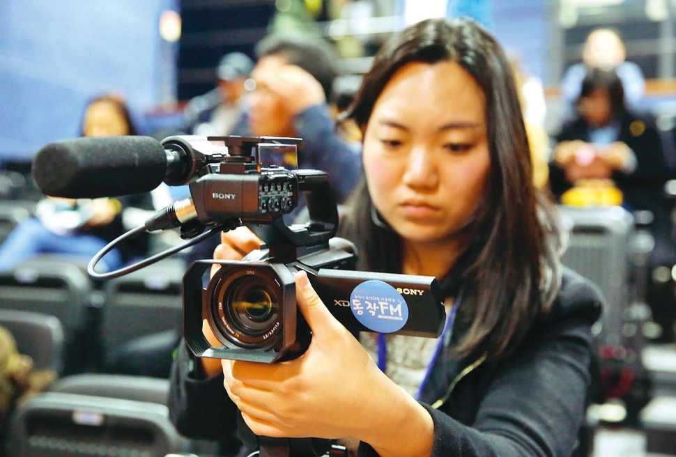 세월호의 진실을 밝히려는 유가족들의 노력을 담은 다큐멘터리 영화 공동체상영회가 12일 서울 동작구 숭실대에서 열렸다. 동작에프엠 운영진이 함께 준비한 이날 행사에서 동작에프엠의 김보람 감독이 세월호 유가족과 주민들의 간담회 장면을 녹화하고 있다. 장철규 기자 chang21@hani.co.kr