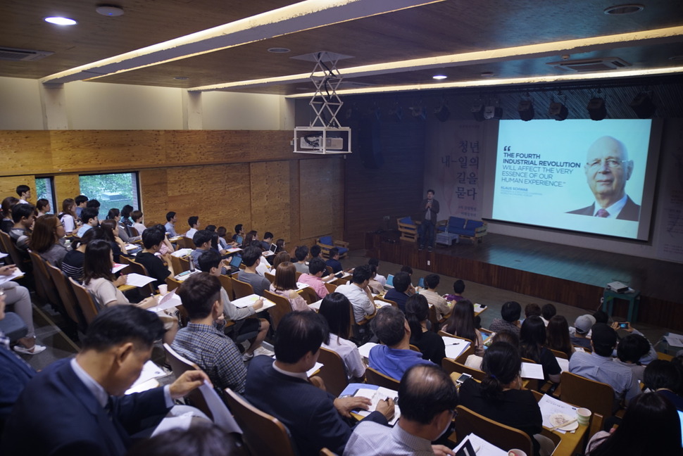 인공지능의 발달이 현재 일자리의 절반 정도를 사라지게 할 것이라는 전망 속에서 새로운 일자리를 만드는 방법을 모색해 보자는 취지로 마련된 강연이었다. 150여 석의 좌석과 복도까지 꽉 채울 정도로 청년들의 관심은 뜨거웠다.