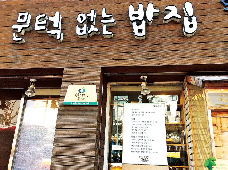 ‘문턱 없는 밥집’은 ‘친환경농산물자조금관리위원회’가 시행하는 ‘친환경 농산물 우수식당’ 녹색 등급을 인증받았다. 주방의 세제도 친환경 제품을 사용하며, 친환경 재료뿐 아니라 화학조미료 및 첨가물이 든 양념류를 사용하지 않는 높은 등급이다. 이렇게 만들어진 유기농 비빔밥의 원가를 따지면 9천원 정도다. 손님들이 내는 밥값은 평균 4천원 정도다. 점심에서 발생하는 손실을 해소하기 위해 저녁엔 건강한 집밥과 유기농 막걸리를 정상 가격으로 판매하고 있다.