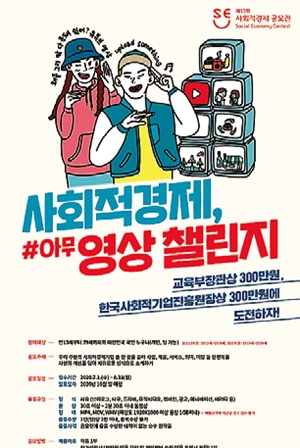 한국사회적기업중앙협의회, 사회적경제활성화전국네트워크, 아이쿱생협연합회, 한겨레신문사가 ‘#사회적 경제, 아무영상 챌린지’ 공모전을 개최한다. 개성을 살려 사회적경제기업을 자유롭게 소개하도록 하기 위해서다. 13~39살 청소년·청년이 브이로그, 다큐, 뮤직비디오 등 30초 이상~2분30초 이내의 동영상을 출품하면 된다. 개인 유튜브 계정에 공모전 관련 해시태그를 적용해 올린 뒤 공모전 누리집(secontest.net)에서 신청서를 내면 된다.