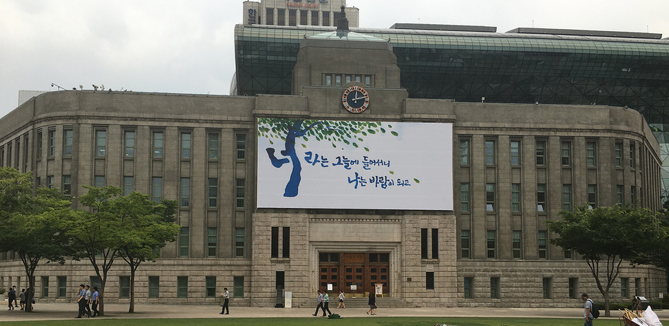서울시는 지난 27일 서울도서관 외벽 ‘꿈새김판’에 새 문안(사진)을 걸었다. ‘꿈새김판’ 문안선정위원회는 배동철(52) 씨의 ‘내가 그늘이 되어 주려 했는데, 네가 먼저 달려와 시원한 바람이 되었구나’와 염상균(39) 씨의 ‘그늘에 들어서니, 어린 시절 그 느티나무’ 문안을 공동 우수작으로 선정하고, 두 작품을 모티브로 문안을 만들어 게시했다. 지난 5월13일부터 19일까지 시민들이 응모한 총 618건의 문안 가운데 우수작 2건을 포함해 총 6건을 선정했다. 이번 여름 문안은 8월 말까지 게시된다. 시민들에게 따뜻한 위로와 희망을 전하고자 서울시는 2013년 6월부터 꿈새김판을 운영해 왔다. 이번이 열두 번째 문안이며, 작품 디자인은 광고디자인 전문업체 (주)이노션의 재능기부로 이어 왔다. ‘꿈새김판’ 글귀 공모는 20자 이내의 순수 창작품을 대상으로 하며, 다가오는 가을 문안 공모는 8월 중 진행될 예정이다. 참가를 원하는 시민은 공모 기간 동안 ‘내 손안의 서울’(mediahub.seoul.go.kr) 시민참여 메뉴에서 작품을 접수시킬 수 있다. 자세한 내용은 서울시 시민소통담당관(02-2133-6417)으로 문의하면 된다.