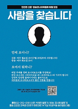 민주언론시민연합이 회원모임인 신문·방송 모니터위원회 회원을 상시 모집한다. 위원회는 매달 주제를 정해 신문이나 방송 뉴스 또는 방송 프로그램을 모니터하고 모니터 보고서를 작성한다. 매주 신문모니터위원회는 월요일 7시, 방송모니터위원회는 화요일 7시에 진행된다. 모니터보고서는 민언련 누리집과 소식지에 실리며, <미디어오늘>과 <오마이뉴스> 기사가 된다.