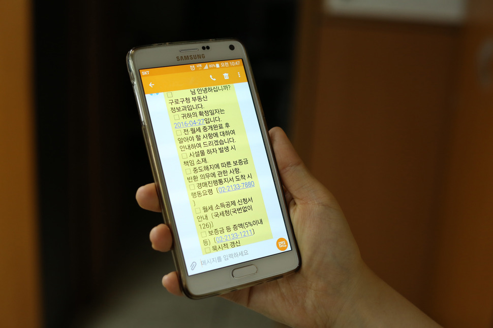 구로구가 세입자들의 재산 보호를 위한 ‘부동산 안전지킴이’ 시스템을 자체 개발했다. ‘부동산 안전지킴이’는 세입자에게 부동산 임차 계약 후 알아야 할 유의사항과 정보 등을 문자로 안내해 주는 시스템이다. 세입자들에게 유용한 정보를 제때 알려 혹시 일어날지 모르는 부동산 계약 피해를 방지할 목적으로 만들었다. 개인정보 제공과 이용에 동의한 세입자는 부동산 거래 후 관련 정보를 두 번 받을 수 있다. 제공 시기는 전입신고하는 날 확정일자를 받을 때와 임차기간 만료 100일 전이다. 확정일자를 받을 때에는 △중도해지에 따른 보증금 반환 △월세소득 공제 등이 안내되며, 임차기간 만료 100일 전에는 △전세 시세 확인 △장기수선충당금 확인 △계약기간 연장에 대한 사항 같은 정보가 전달된다.