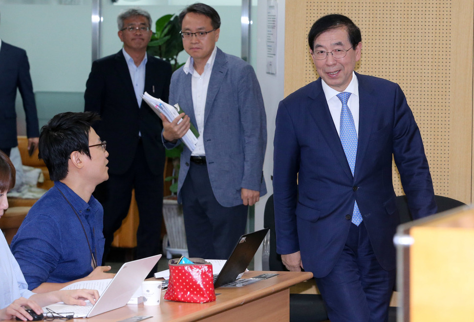 박원순 서울시장(오른쪽)이 취임 2주년 기자간담회를 하기 위해 5일 오전 서울 중구 서울시청 브리핑실에 들어서고 있다. 김정효 기자 hyopd@hani.co.kr