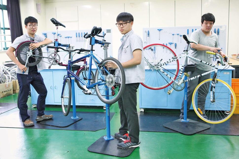 지난달 30일 오전, 성수공업고등학교 학생 셋이 자전거 정비 실습실에서 두 달 동안 자신들이 새로 만든 자전거 곁에 서 있다. 장수선 인턴기자 grimlike@hani.co.kr