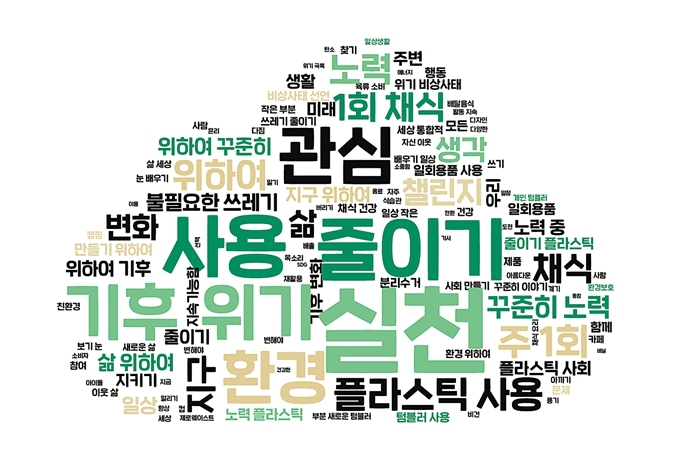 활동을 마친 뒤 참여자들은 한 줄 실천선언문을 썼다. 실천 과정에서 느끼고 변화한 일상의 내용과 앞으로 지속할 활동에 대한 내용을 담았다. 서울시 전환도시정책팀이 실천선언문을 구글폼 등 다양한 방법으로 받아서 워드클라우드 분석을 해보니 선언문에서 가장 많이 사용한 단어는 ‘실천’이었다. 기후위기, 채식, 사용 줄이기, 관심, 환경 등도 많이 언급됐다.