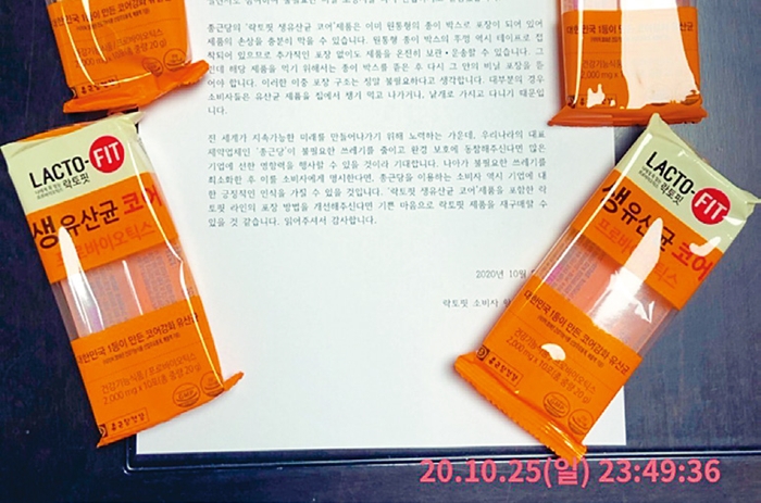 ‘과대 포장재를 반납하며 기업에 변화 요청 편지 보내기’ 프로젝트 참여자가 작성한 편지와 불필요한 포장재.