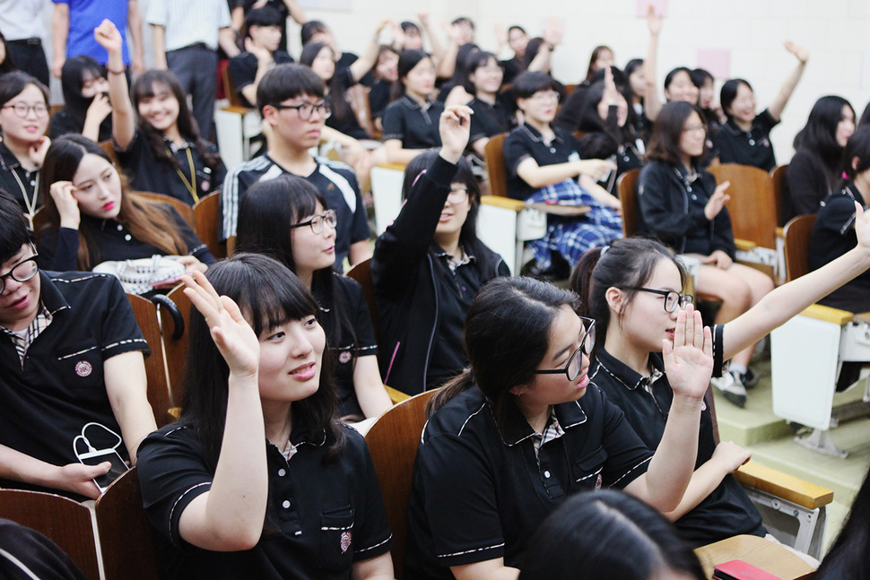 12일 오후 상일미디어고등학교 학생들이 시청각실에서 열린 노동인권교육 강연에서 강사의 질문에 손을 들며 열심히 호응하고 있다. 장수선 인턴기자 grimlike@hani.co.kr