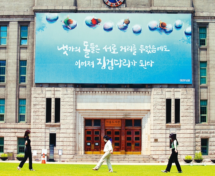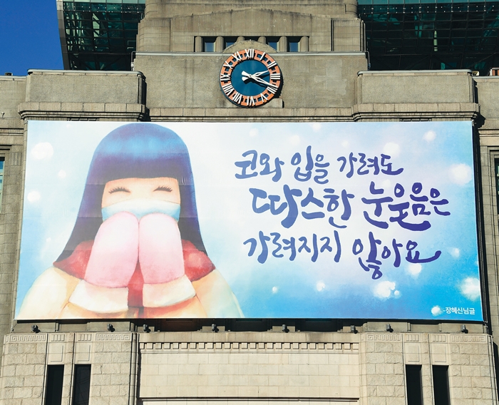 지난 16일 서울도서관 정면 외벽을 장식한 2020년 겨울 꿈새김판은 “코와 입을 가려도 따스한 눈웃음은 가려지지 않아요”라는 문안을 통해 코로나 극복을 위한 시민들의 마음을 표현했다. 시민 공모로 선정되는 서울시 꿈새김판 문안은 올해의 경우 봄