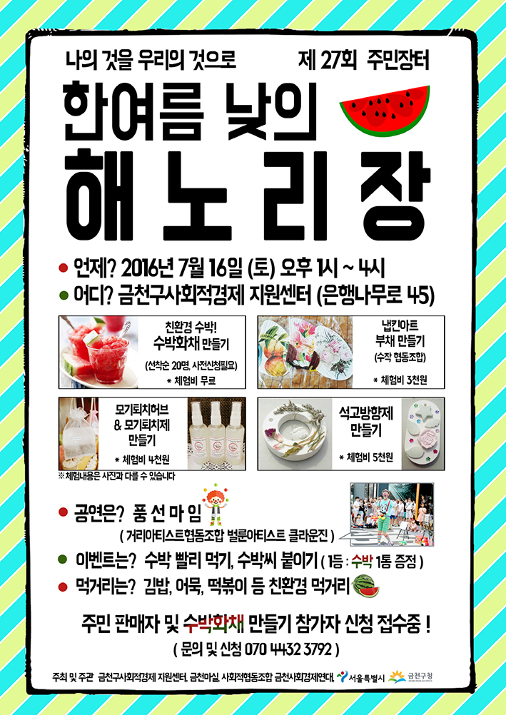 이번 해노리장은 서울거리아티스트 협동조합의 벌룬아티스트 클라운진이 풍선마임 공연을 펼쳐 남녀노소가 함께 흥겹게 즐길 수 있는 시간을 마련할 예정이다. 또한 수박화채 만들기, 냅킨아트 부채 만들기, 석고방향제 만들기 등 가족과 함께 할 수 있는 다양한 체험 활동도 마련되어 있다. 행사 참여를 원하는 주민은 누구나 함께할 수 있으며 자세한 사항은 금천구 사회적경제지원센터(070-4432-3793)로 문의하면 된다.