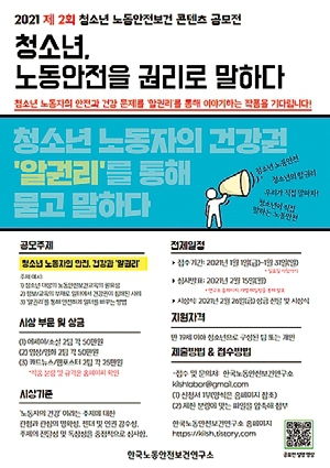 한국노동안전보건연구소가 1월31일까지 ‘2021 청소년 노동안전보건콘텐츠 공모전’을 한다. 19살 이하 청소년으로 구성된 팀 또는 개인이라면 참가할 수 있다. ‘청소년 노동자의 안전, 건강과 알 권리’를 주제로 에세이·소설, 영상·영화, 카드뉴스·웹 포스터를 만들어 한국노동안전보건연구소 누리집(kilsh.tistory.com)에서 신청서를 내려받아 작성한 뒤 전자우편(kilshlabor@gmail.com)으로 내면 된다.