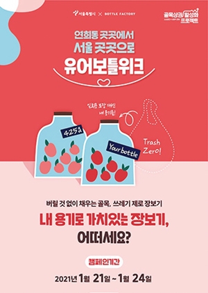 서울시사회적경제지원센터가 보틀팩토리와 21일부터 24일까지 친환경 소비문화 조성을 위한 ‘유어보틀위크’ 캠페인을 진행한다. 이번 캠페인은 골목상권 활성화 프로젝트 참여 소상공인, 골목상점 30여 곳과 연계해 운영된다. 당근마켓 앱, 또는 골목 시그널 누리집(alleysignal.org)에서 참여 상점을 확인한 뒤 개인 용기를 갖고 해당 상점을 방문하면 된다. 참여자에게는 선착순으로 친환경 밀폐 용기를 증정한다.