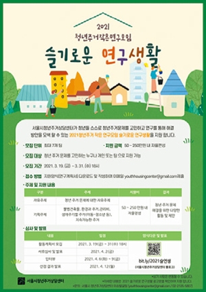 서울시청년주거상담센터가 31일까지 2021 청년 주거 작은 연구모임 참여자를 모집한다. 청년 주거 문제에 대한 자유주제나 기획주제(불법 건축물, 환경과 주거 등) 중 선택해 개인 또는 팀으로 지원할 수 있다. 참여 모임에는 소정의 연구비와 월간 프로그램, 멘토링 등이 지원된다. 서울시청년주거상담센터 블로그(blog.naver.com/youthhousingcenter)에서 연구계획서를 내려받아 작성한 뒤 전자우편(youthhousingcenter@gmail.com)으로 내면 된다.