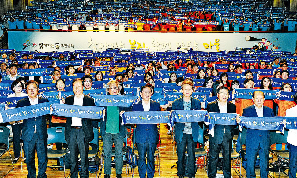 박원순 서울시장은 인사말에서 “내 목소리를 알아주는 게 얼마나 고마워요” 하고 말했던 영상 속 홍학용 어르신의 말을 강조하며 “도로 건설에만 수천 억 원이 드는데, 찾동을 시행하는 데 200억 원 정도가 들었다. 찾동이 가져온 시민의 만족도를 주목해 달라”고 했다. 서울시는 13개 자치구 80개 동에서 1년 동안 시행한 찾동 1단계 결과로 빈곤 위기가구 1만2881곳을 찾아냈고, 우리동네주무관과 복지플래너, 방문간호사 등이 주민을 13만2210번 방문했다고 밝혔다. 이는 사업 시행 전 1년과 비교해 복지 대상자 방문 횟수가 2.5배 늘어난 수치다. 서울시는 지난 18일부터 18개 자치구 283개 동에서 찾동 2단계를 시작했고, 2018년까지 서울시 전역으로 확대할 예정이다. 김정엽 기자, 사진 서울시 제공