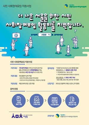 서울시생활속민주주의학습지원센터가 시민 사회참여모임 활동비를 지원한다. 사회 문제 해결을 위해 활동하는 서울생활권 시민 3명 이상의 모임이면 신청할 수 있다. 센터의 월별 주제를 다루거나 정책 제안을 위한 모임이면 우선 선정된다. 시민참 누리집(simincham.net) 회원 가입 뒤 모임 등록과 기록이 이뤄지며, 승인된 활동에 대해 활동비가 지원된다.