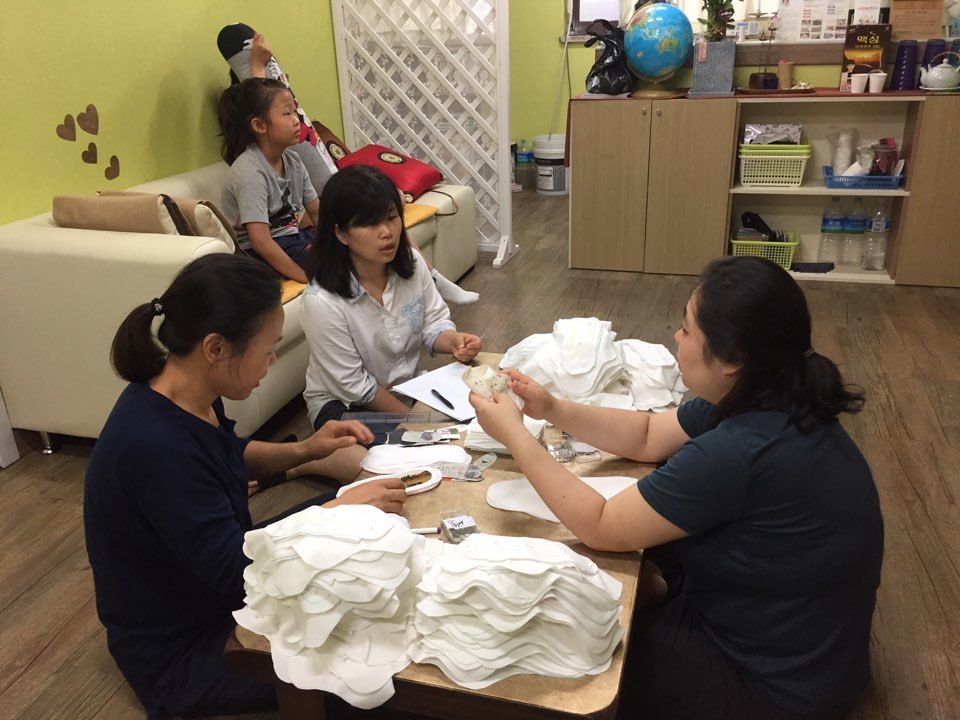천생리대를 만드는 자원봉사자들. 강서구 곳곳에서 천 재단과 재봉, 비누를 만드는 손길이 새벽까지 이어졌다.