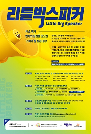 서울시사회적경제지원센터가 ‘2021년 리틀 빅스피커’ 참여자를 모집한다. 기후위기 대응 등 사회적 가치를 주제로 프로젝트를 제안하면 된다. 선정되면 실행비와 네트워킹 프로그램 지원을 받는다. 모집 대상은 19~34살 청년 여성 또는 대표자가 이에 해당하는 팀이다. 서울사회적경제 누리집(sehub.net)에서 양식을 내려받아 작성한 뒤 전자우편(littlebigspeaker@gmail.com)으로 8월6일까지 신청하면 된다.