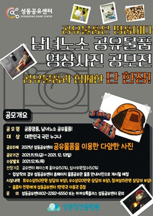 성동공유센터가 12일까지 ‘공품명품, 남녀노소 공유물품!’ 공모전을 한다. 올해 센터 공유물품 가운데 한 가지 물품을 이용한 영상, 사진 등을 1인당 3점 이내로 참가신청 서류와 함께 전자우편(sdshare6550@naver.com)으로 제출하면 된다. 출품자 전원에게 센터 1만원 이용권을 준다. 수상자 10명에게는 부상(최우수 50만원, 우수 20만원, 장려 5만원)이 있다. 문의: 성동공유센터 02-2282-6550