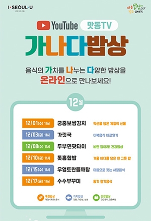 서울시식생활종합지원센터가 식(食)체험프로그램 ‘가나다밥상’ 12월 행사를 한다. 1~17일 수, 금요일 오전 11시 온라인으로 진행한다. 궁중보쌈김치, 가릿국, 두부면팟타이, 톳홍합밥, 우엉토란들깨탕, 수수부꾸미를 주제로 다룬다. 먹거리에 관심 있는 시민 누구나 참여할 수 있다. 네이버 예약에서 ‘맛동 가나다밥상’을 찾아 희망하는 수업을 신청하면 된다. 문의: 서울시식생활종합지원센터 070-4285-3981