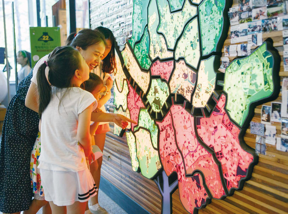 지난 11일 오전 원전하나줄이기 정보센터에서 개최한 ‘2016년 여름 붕어빵 캠프’에 참여한 가족이 25개 자치구의 에너지 소비 현황을 실시간 다양한 색상으로 알려 주는 ‘서울에너지 나무’를 보고 있다. 에너지 소비량이 높은 지역은 붉은색으로 표시되어 있다. 장수선 인턴기자 grimlike@hani.co.kr