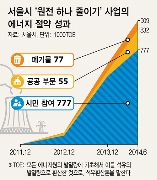 변화의 열쇠는 2012년 서울시가 시작한 ‘원전 하나 줄이기' 사업이다. 시민과 함께 에너지를 절약하고 친환경 에너지 생산을 확대해, 2014년까지 원자력발전소 한 기가 생산하는 만큼인 200만TOE(석유환산톤, 석유 1톤을 태울 때 생기는 에너지를 1석유환산톤이라고 한다. 1TOE는 1000만㎉에 해당한다)의 에너지를 대체하자는 것이다.