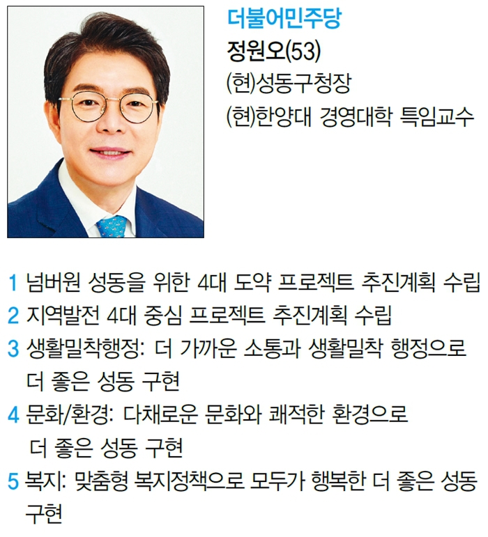 지역일꾼을 뽑는 6‧1 지방선거가 닷새 앞으로 다가왔다. 이번 선거에서 서울시민은 시장, 교육감, 구청장, 시의원, 비례시의원, 구의원, 비례구의원 7명을 뽑는다. 집집이 두툼한 후보자 선거공보물이 배달되지만, 우편함에 꽂힌 채 그대로 있는 경우도 적잖다. 실생활과 아이들 교육 문제가 달린 만큼 유권자들이 지방선거 후보의 공약을 한눈에 살펴볼 수 있도록 <서울&>은 제8회 전국동시지방선거 서울지역 구청장 후보들이 내세운 5대 공약을 소개한다. 이들 공약은 중앙선거관리위원회 누리집(www.nec.go.kr)에 등록된 후보자 선거공보와 공약 정보를 토대로 정리한 것이다.