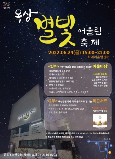 노원구가 ‘옥상 별빛 어울림축제’를 개최한다. 24일 열리는 이번 행사는 지난해 문을 연 복합문화공간인 하계어울림센터(하계1동)에서 1부와 2부로 나뉘어 진행된다. 아이부터 어르신까지 모든 세대가 즐길 수 있는 다양한 프로그램과 공연이 준비됐다.