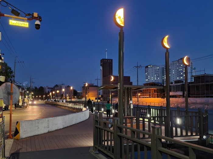 경관조명은 초승달부터 그믐달까지 다양한 모양이다. 달이 차오르고 기우는 모습을 표현해 보행자가 보는 즐거움을 느낄 수 있다. 데크길 끝에는 초승달 모양의 조명 의자 2개를 추가로 설치해 주민들이 잠시 쉬어 갈 수 있는 쉼터로 조성했다.