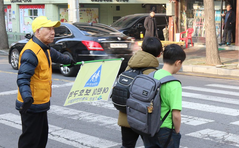 오전 8시, 송파 신가초등학교 건널목 앞에서 박명조(78)씨가 노란 깃발을 흔들며 교통지도를 하고 있다. 책가방을 멘 아이들이 옹기종기 모여 박씨가 건너라고 깃발을 열어줄 때까지 기다리고 있다. 차도를 확인하고 건너라고 한 뒤에야 아이들은 학교를 향해 뛰어갔다. 감사하다는 인사를 전하는 학부모와 아이도 있다.