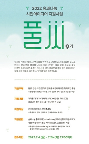(재)숲과나눔이 시민 아이디어 지원사업 ‘풀씨 9기’ 참여자를 26일까지 모집한다. 환경·안전·보건 분야의 문제를 해결하기 위한 아이디어이다. 개인 또는 단체 누구나 참여할 수 있으며, 채택된 아이디어에 대해 최대 300만원, 최대 50팀을 지원한다. 숲과나눔 누리집(koreashe.org)에서 신청서를 내려받아 작성한 뒤 온라인 링크(bit.ly/seed9)로 내면 된다.